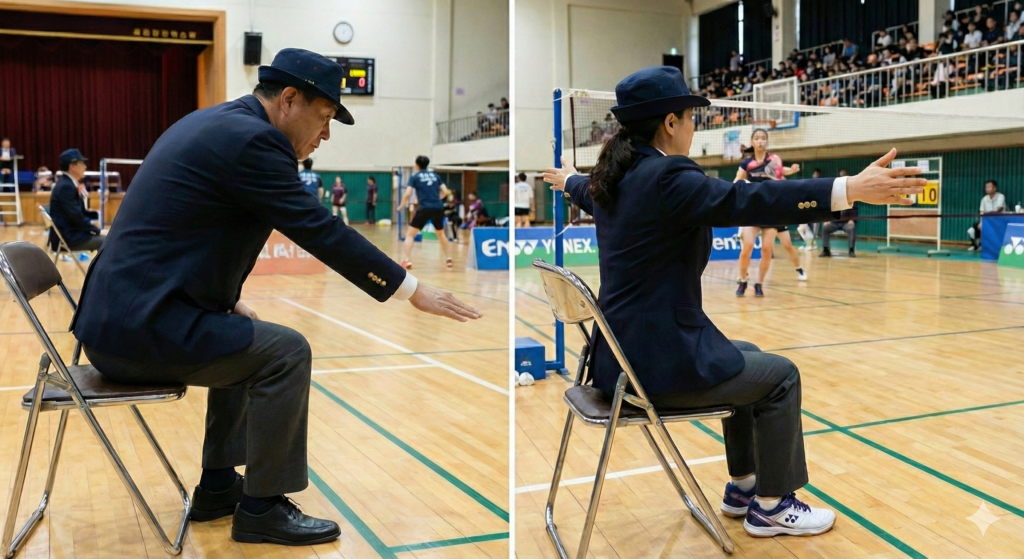 - アウト: シャトルが完全にラインの外側に落ちた場合。両腕を水平に広げて合図します。
