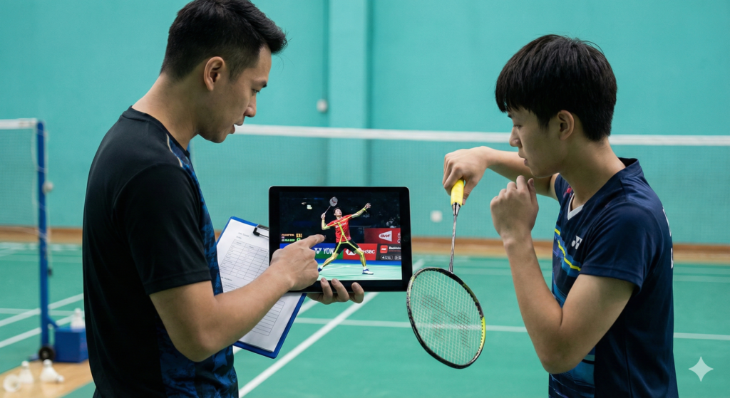 動画を見る際は、シャトルの行方ではなく打つ前の準備と全身の連動に注目してください。