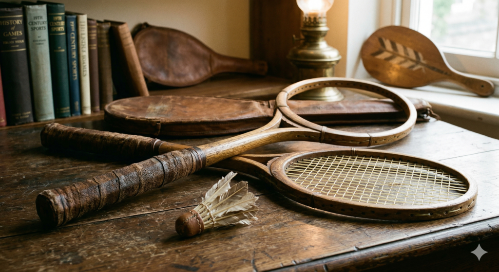 バドミントンの原型は、19世紀中頃にイギリス軍がインドから持ち帰ったプーナという遊びにあります。当時のラケットは、現代のような機能美とは程遠いものでした。